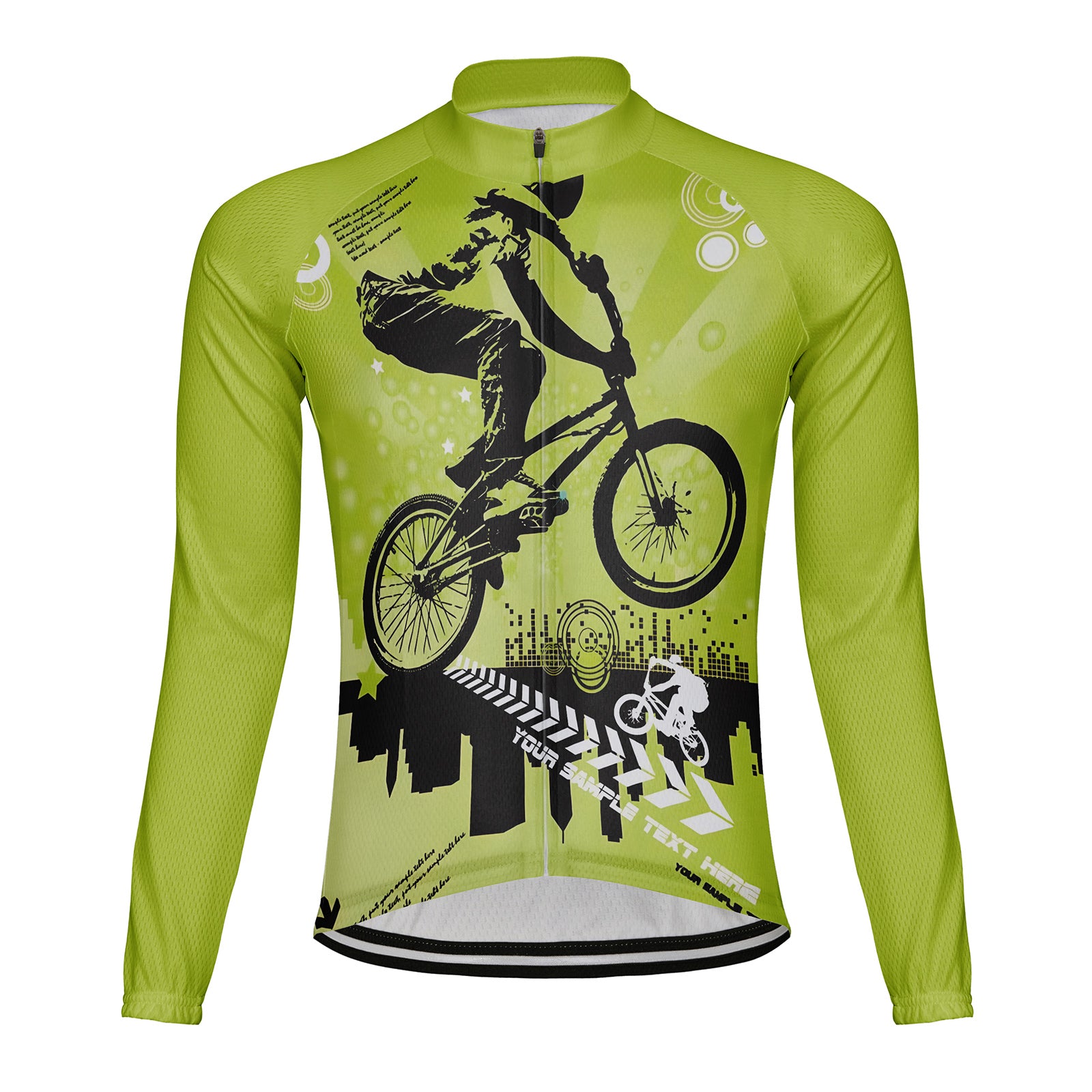 The Your Sample Text Here cycling jersey with fleece lining keeps you warm.100% polyester and stretch fabric.temperature range 41 °F to 68 °F. suitable for spring, autumn and winter riding